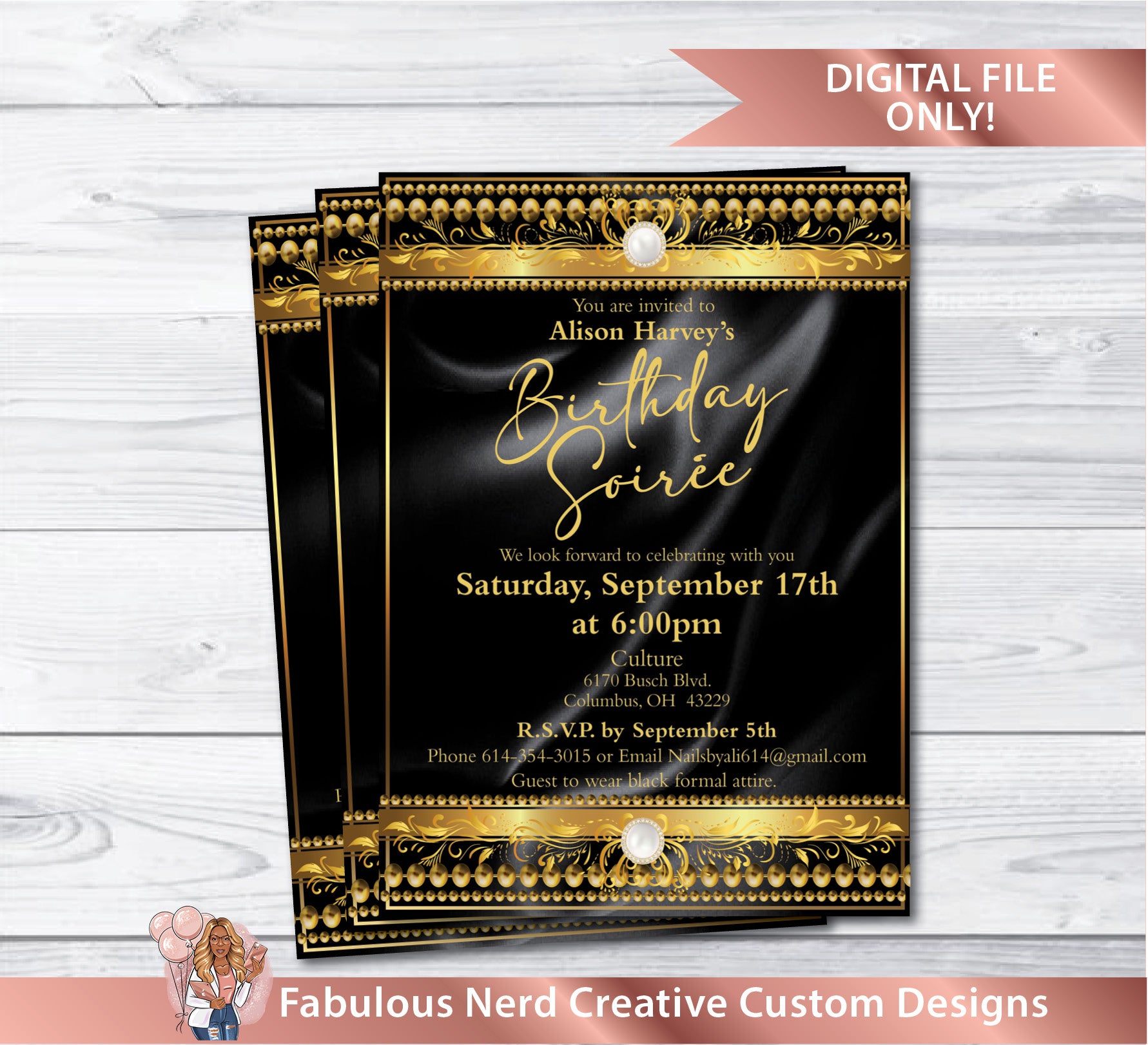 Adult Birthday Party Invitation (Black & Gold) - Digital File Only
