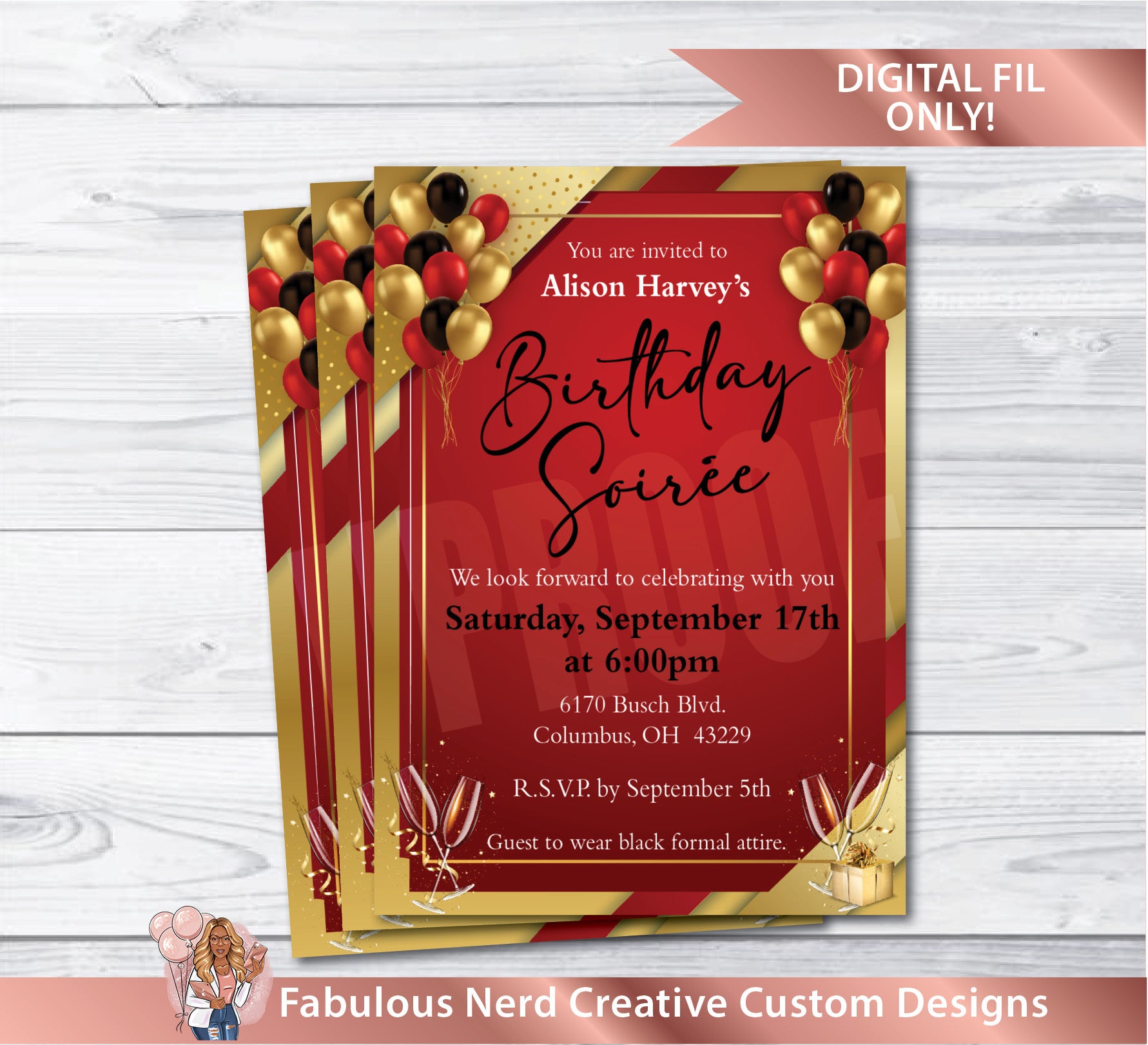 Adult Birthday Party Invitation (Red & Gold) - Digital File Only