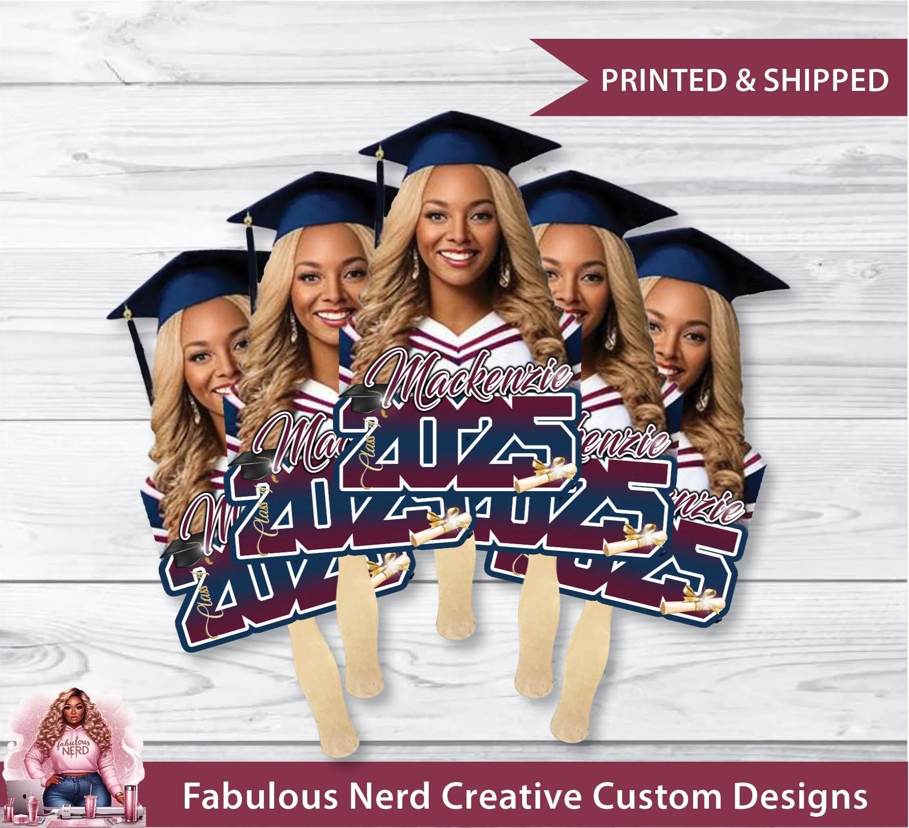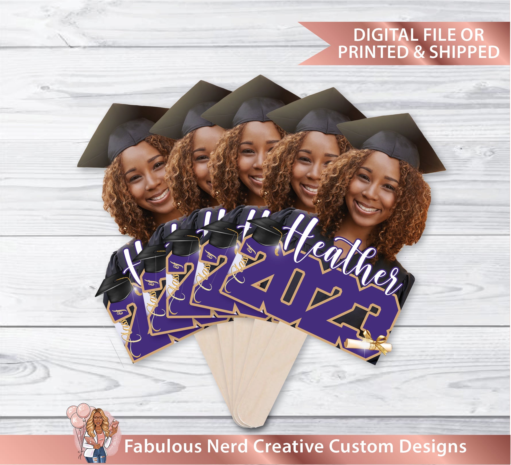 These big head photo fans are custom made to order. The fans are HANDMADE and and laminated. Creative and fun way to make your students graduation stand out. This is a handheld size fan made to fill a standard 8.5"x11" sheet.