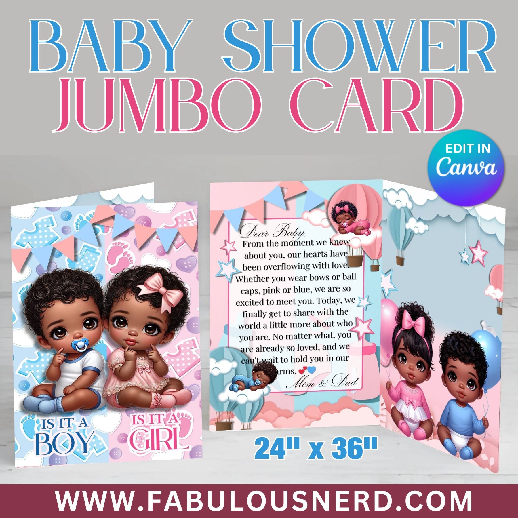 Celebrate your special baby shower with the Gender Reveal 2, a unique and memorable keepsake. This digital file lets you customize the charming design easily in Canva, adding a personal touch that will delight any parent-to-be. Perfect for creating lasting memories, this jumbo card stands out as a thoughtful and creative gift.