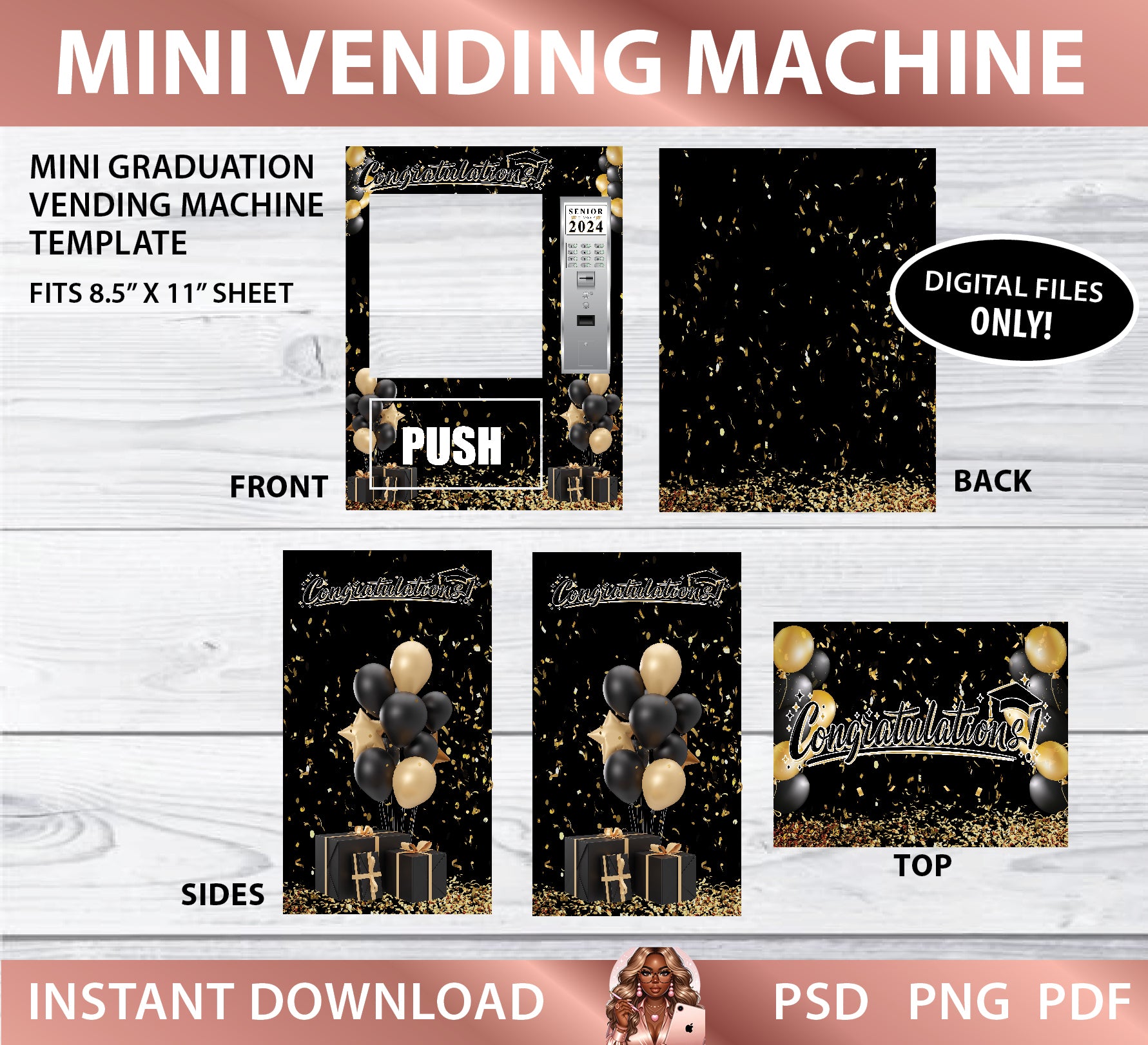 Elevate your graduation celebration with our Mini Graduation Vending Machine Template! This unique gift allows you to fill it with custom graduation items or treats, making it a thoughtful and memorable present. Easily customizable using a standard 8.5"x11" sheet of paper. Make their graduation day even more special!