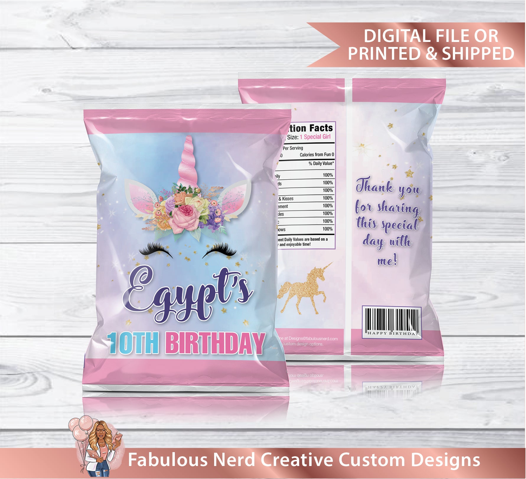Unicorn Birthday Customizable Chip Bag-Snack Bag-Favor Bag-Digital File or Printed & Shipped